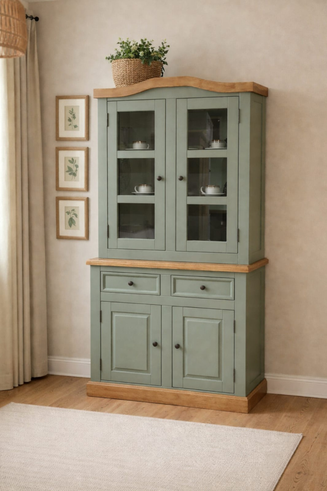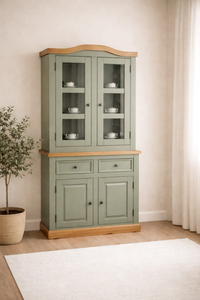 2142 - Armário com Cristaleira 02 portas Verde Musgo Envelhecido com Cêra.