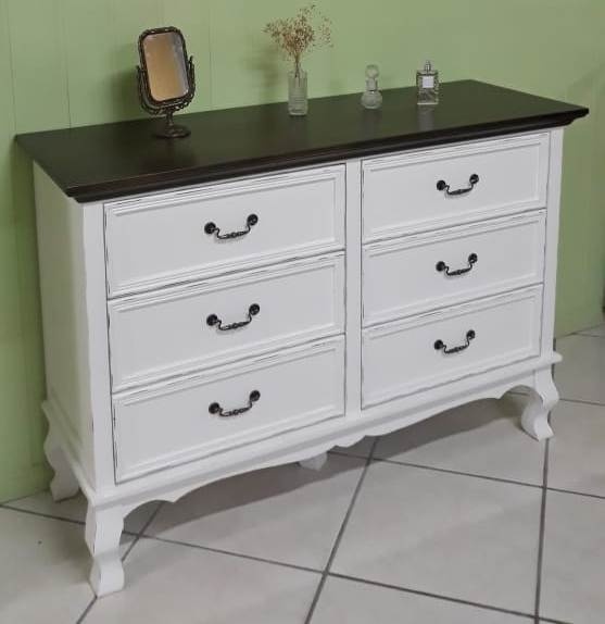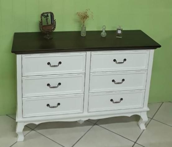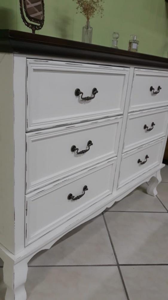 2183 - Cômoda Luis Felipe com 06 gavetas Branco Laqueado com desgaste e tampo Castanho Envelhecido
