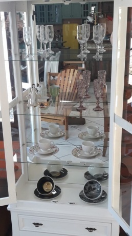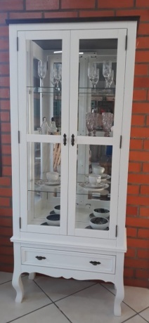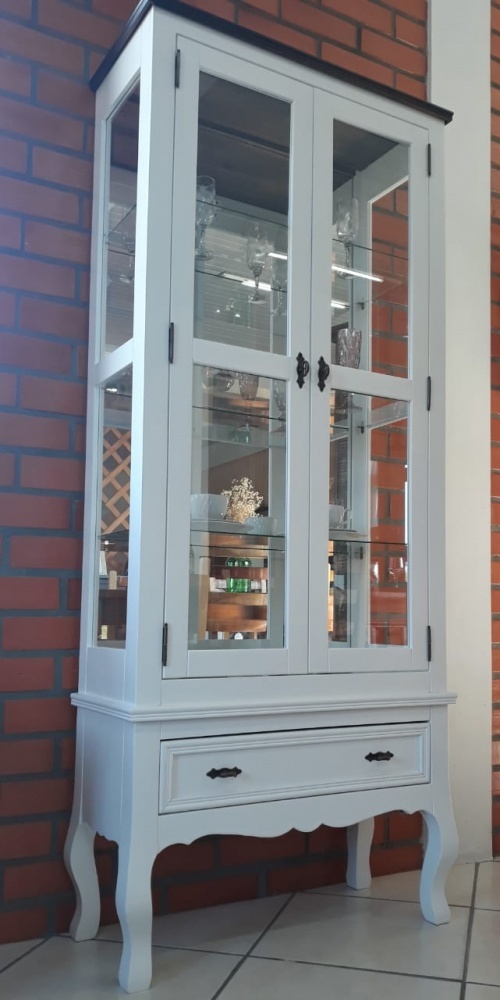 2382 - Cristaleira Charlotte 02 portas Alta Branca Laqueada com teto Castanho Envelhecido com Espelho e Prateleira de Vidro