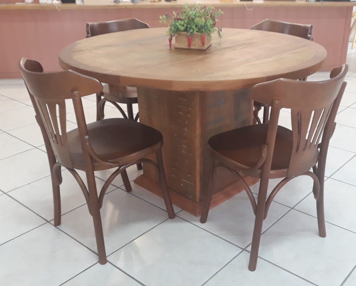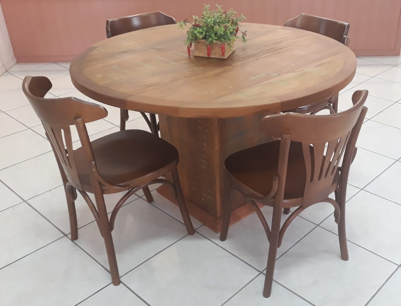 2542 - Conjunto de Mesa Redonda em Madeira de Demolição com 04 Cadeiras Berlim Castanho
