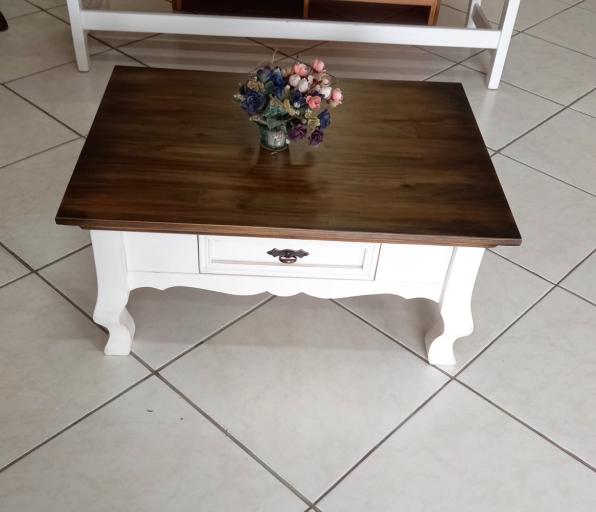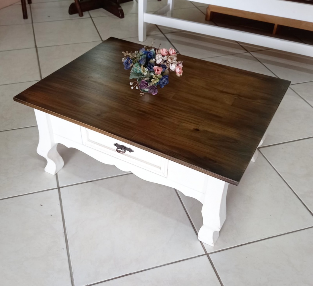 2560 - Mesa de Centro com pés Luis Felipe Branca Laqueada com Tampo Castanho Envelhecido