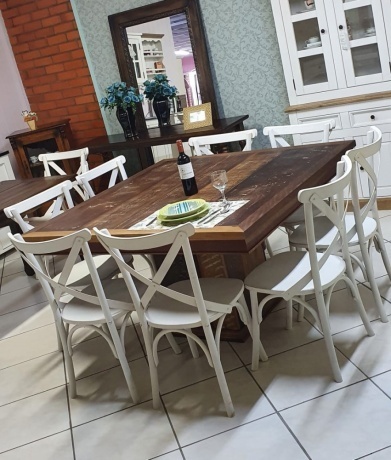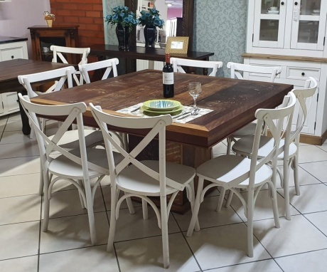 2951 - Conjunto de Mesa Quadrada em Madeira de Demolição com Pé Central e 08 Cadeiras x Provençal