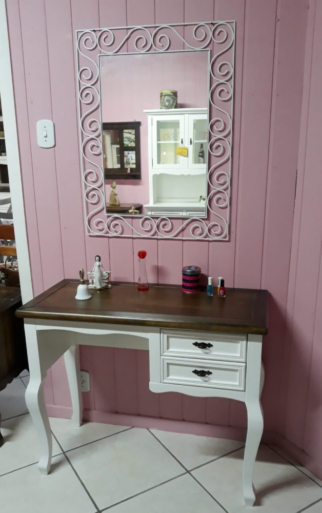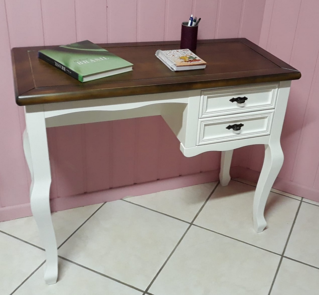 2956 - Escrivaninha Luis Felipe 02 gavetas Branco Laqueado com Tampo Castanho envelhecido