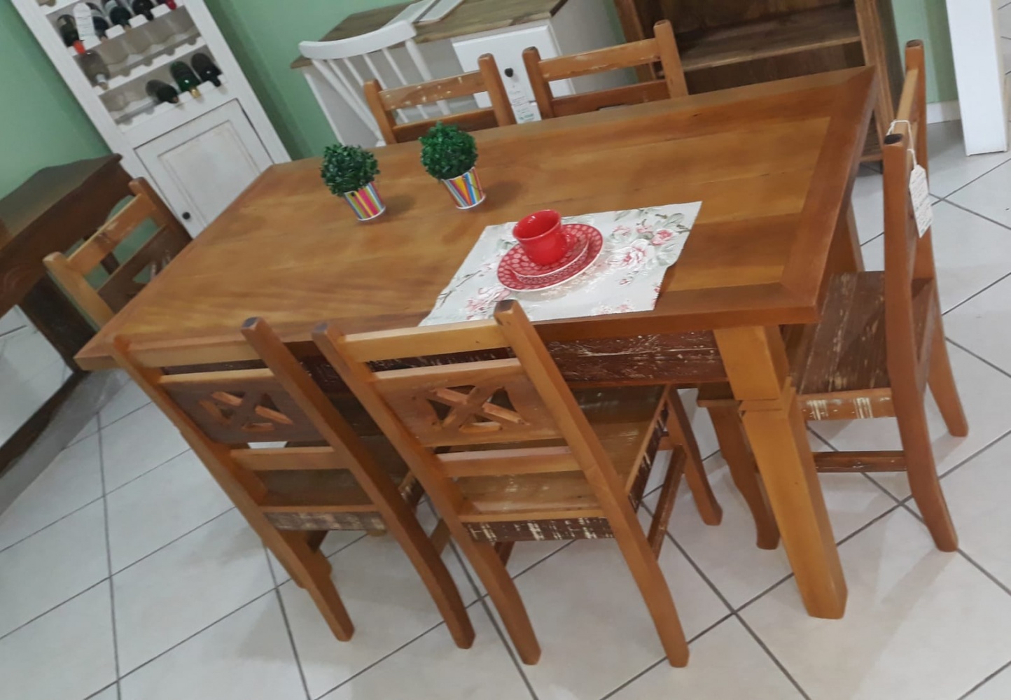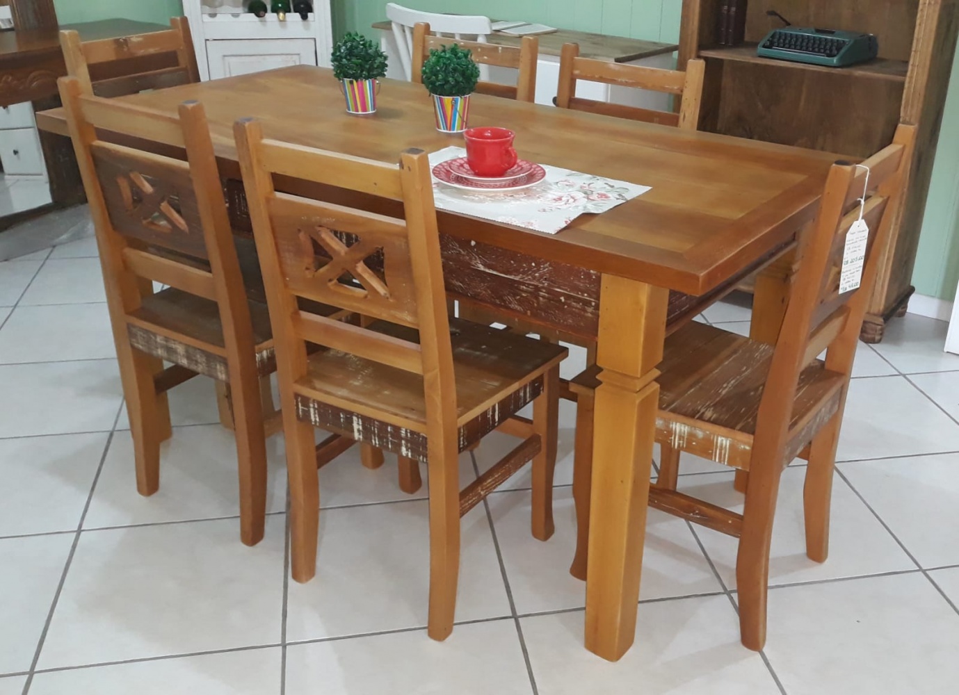 3014 - Conjunto de Mesa e 06 Cadeiras com Recorte X em Madeira de Demolição