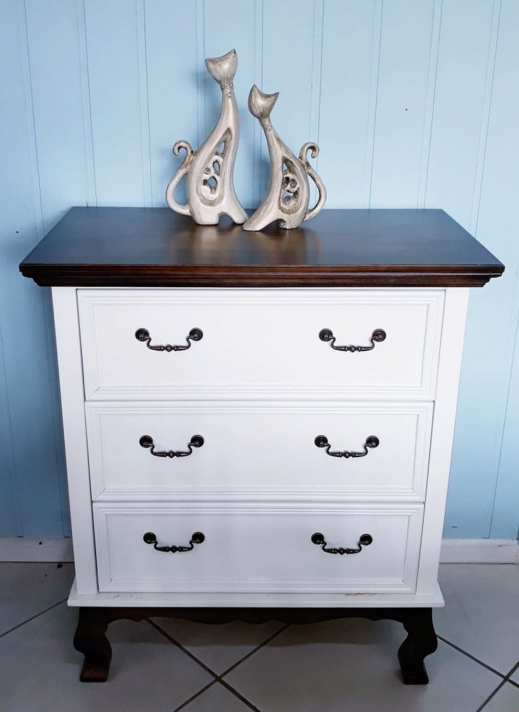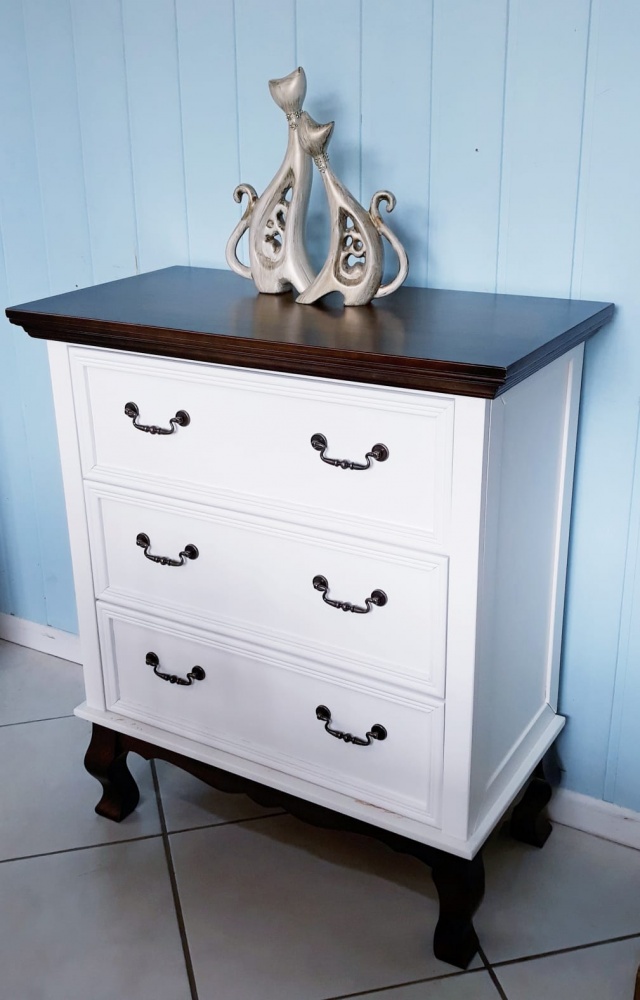 3098 - Cômoda Luis Felipe 03 Gavetas Branco Laqueado com Tampo e base Castanho Envelhecido