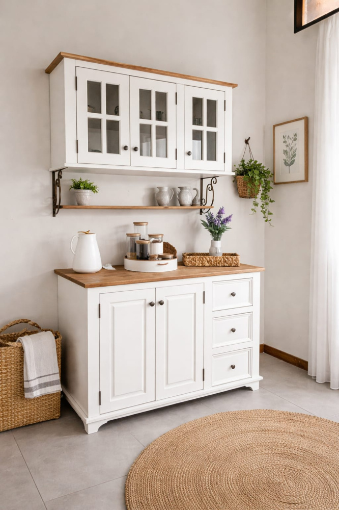 3498 - Balcão com tampo (1,20L x 0,52P x 0,89), Aéreo (1,20L x 0,32P x 0,63A) + prateleira com mão francesa em ferro - Provençal(branco envelhecido) com Cêra