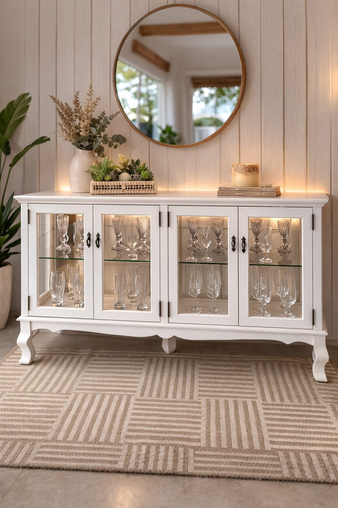 3500 - Cristaleira Horizontal Luis Felipe Branca Laqueada com espelho e prateleiras de vidro