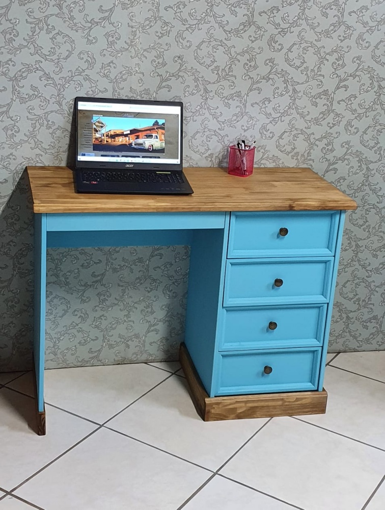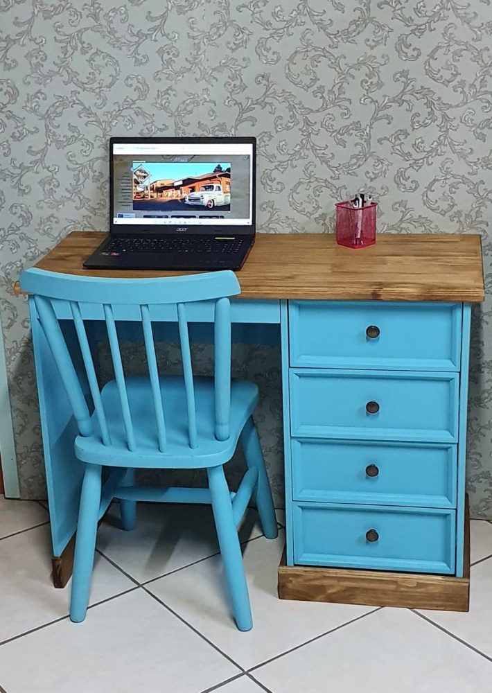 2750 - Escrivaninha 04 Gavetas Azul Antigo Envelhecido com Cêra - Cadeira não Inclusa