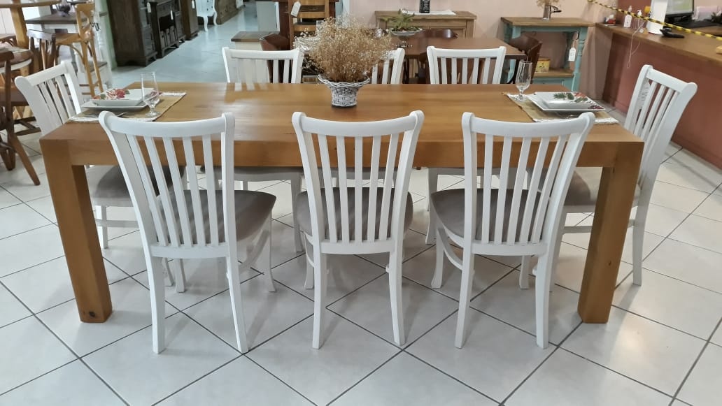 2757 - Conjunto de Mesa Reta em Madeira de Demolição com 08 Cadeiras Sol Branca Laqueada