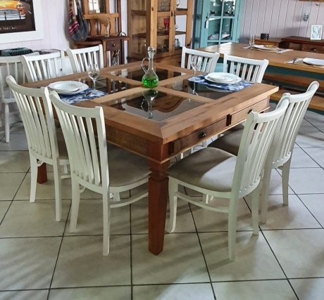 2950 - Conjunto de Mesa Quadrada em Madeira de Demolição com Vidros no Tampo e 08 Cadeiras Sol Provençal