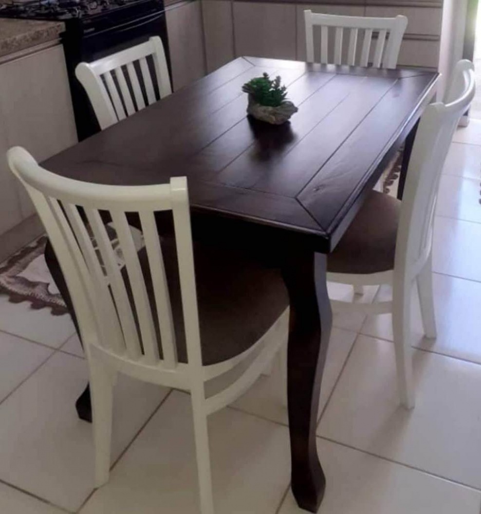 2964 - Conjunto de Mesa com Pés Luis Felipe Castanho Envelhecido com 04 Cadeiras Sol Brancas Laqueadas